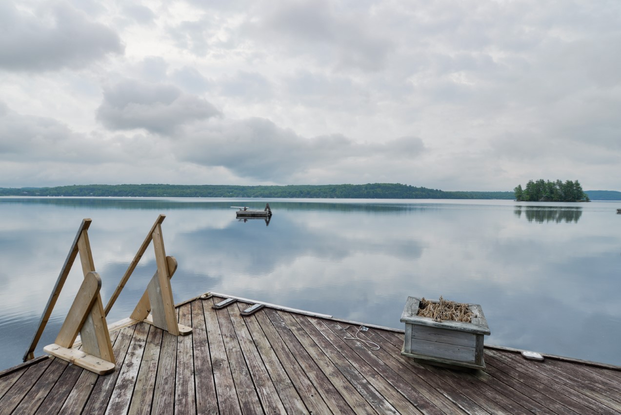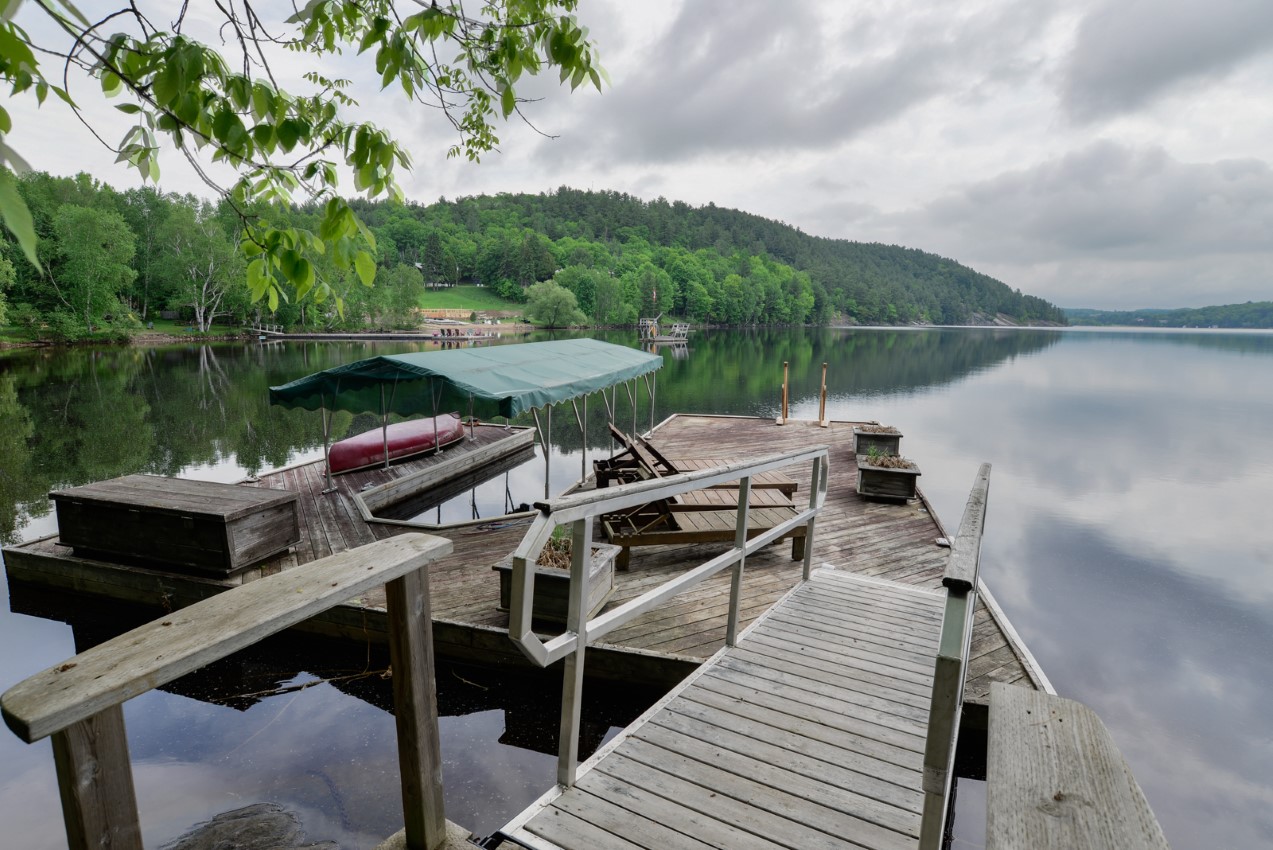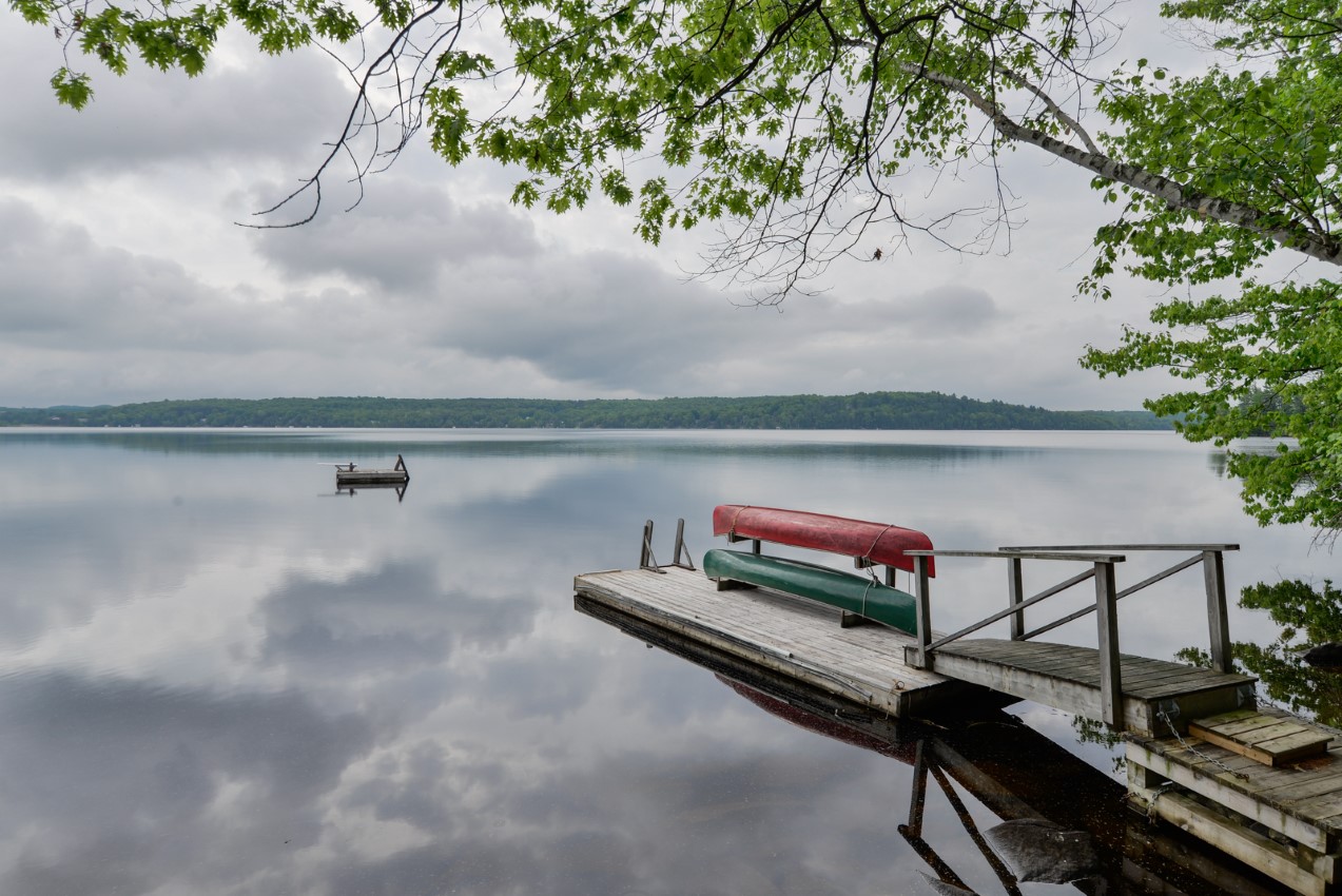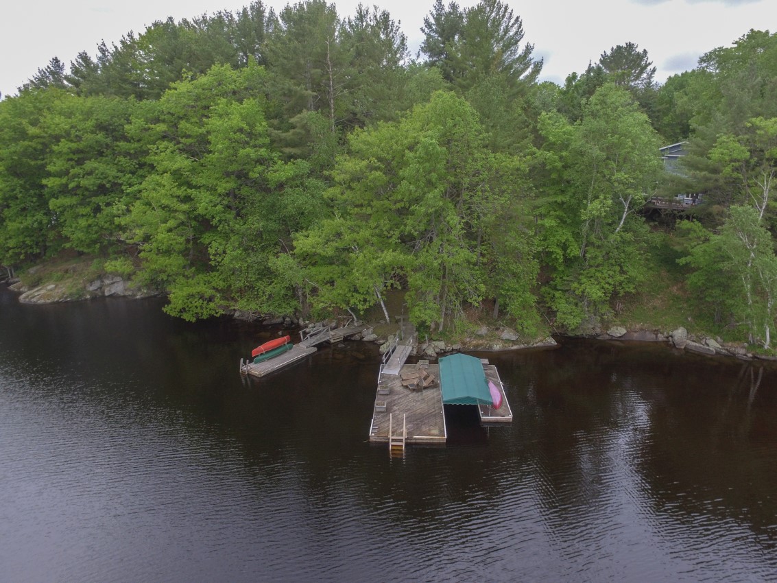 This gorgeous property has 330 ft frontage, just under an acre of land, is level at the parking area and gently sloping to the waterfront. Wonderful long view across the lake to granite cliffs, southeast exposure, lots of sun. Superb privacy. Shoreline is rocky at the docks but there is also a shallow, sandy area at the north end of the property.