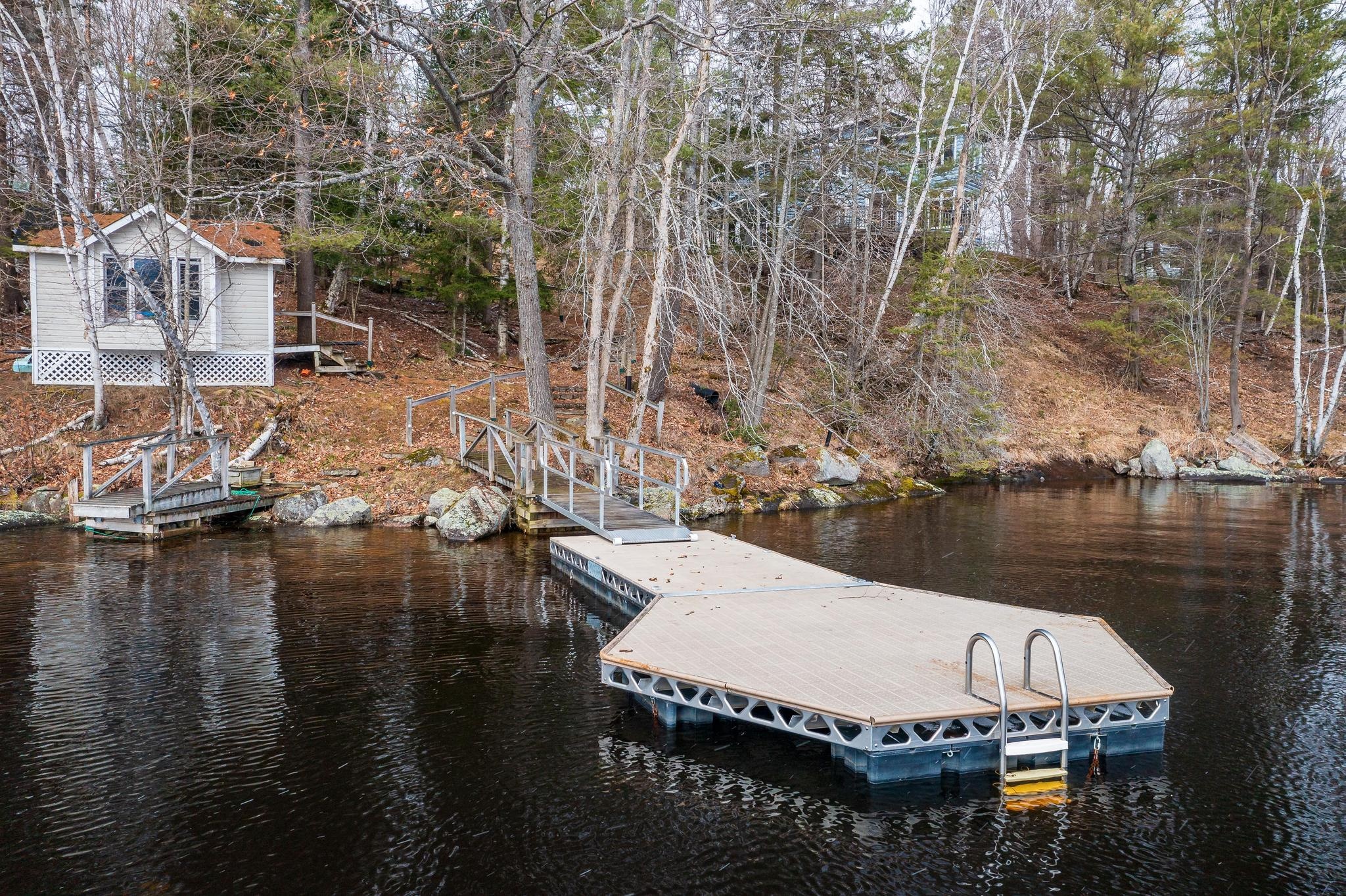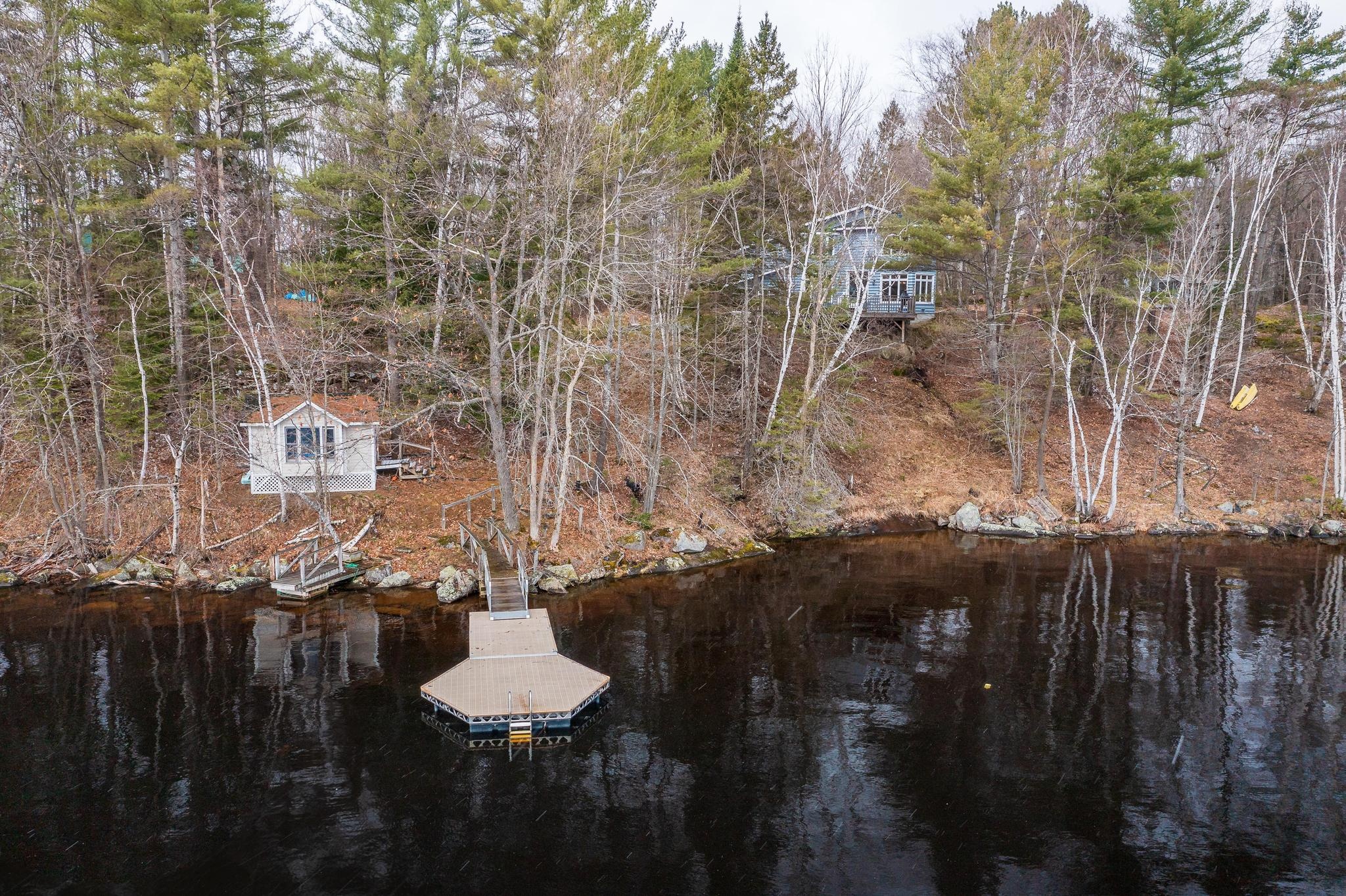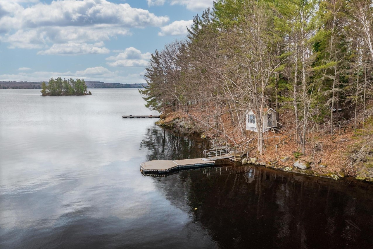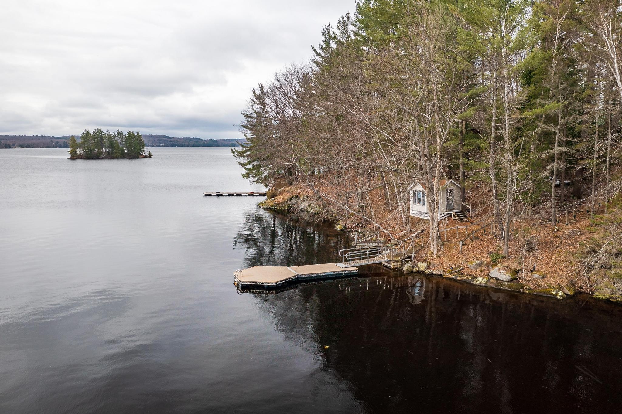 The cottage/home as it is right now has four bedrooms plus a den, three full bathrooms, about 2500 sq. ft. of living space on 4 levels with the master suite being on the upper floor. Stairs to each level are easy to navigate. There is a bedroom and bathroom on the ground floor for one-floor living if needed. Renovations were completed in 2006. There is a walkout from the living/dining area to a large deck overlooking the lake. Two bunkies offer accommodation for overflow guests, with one of the bunkies by the water’s edge. Newer Canada Docks docking system.