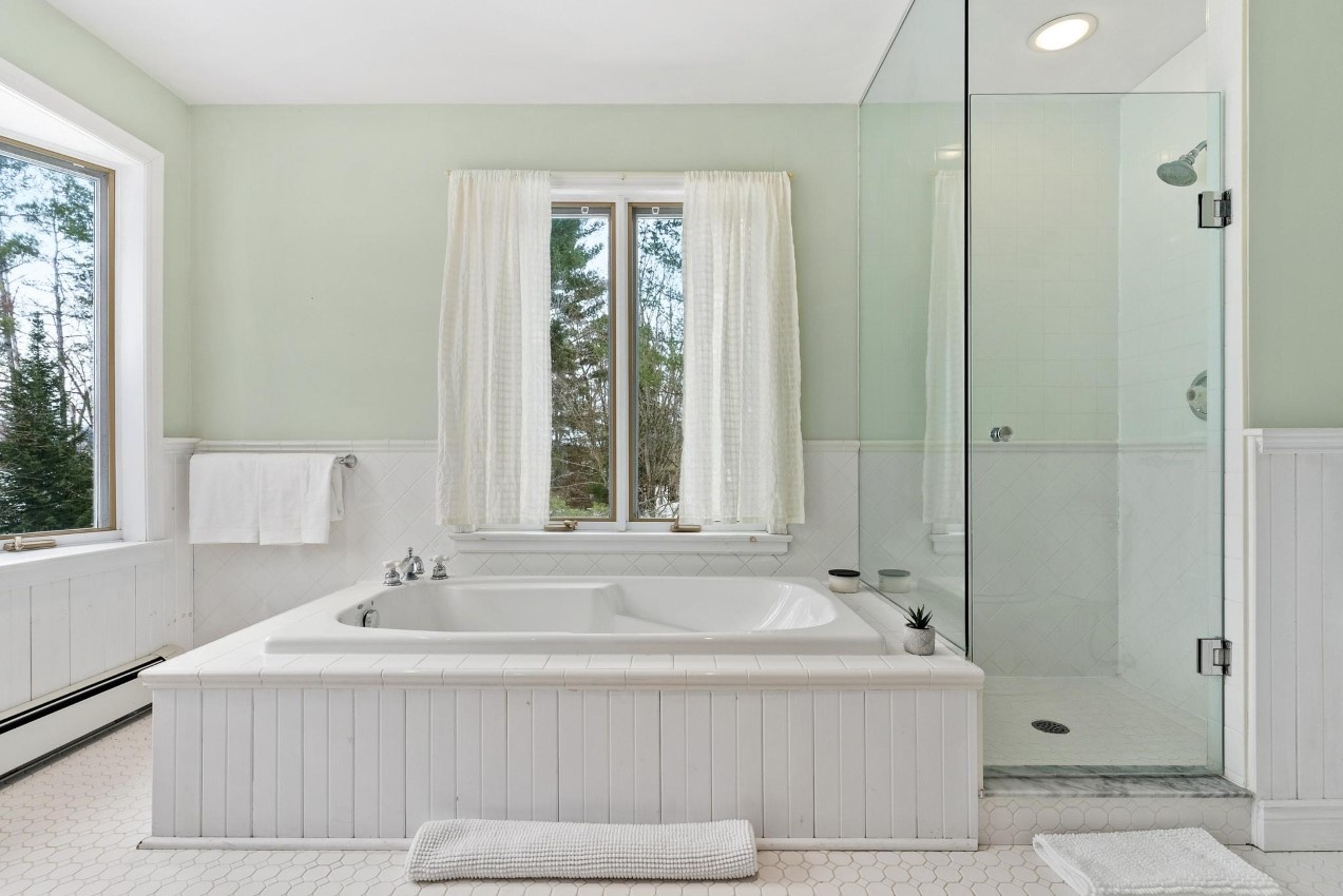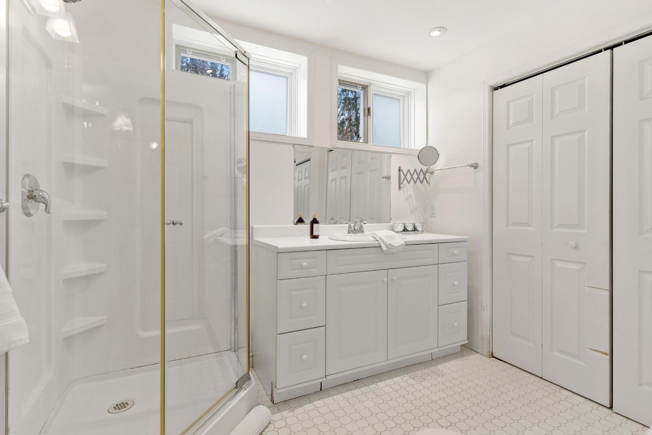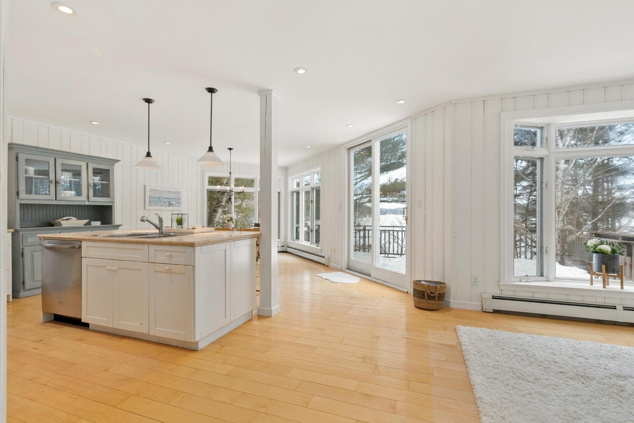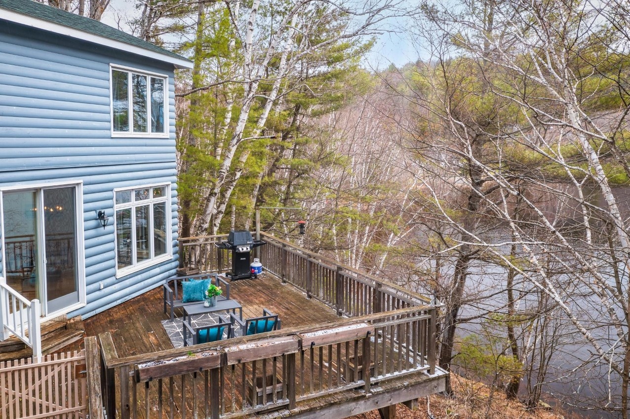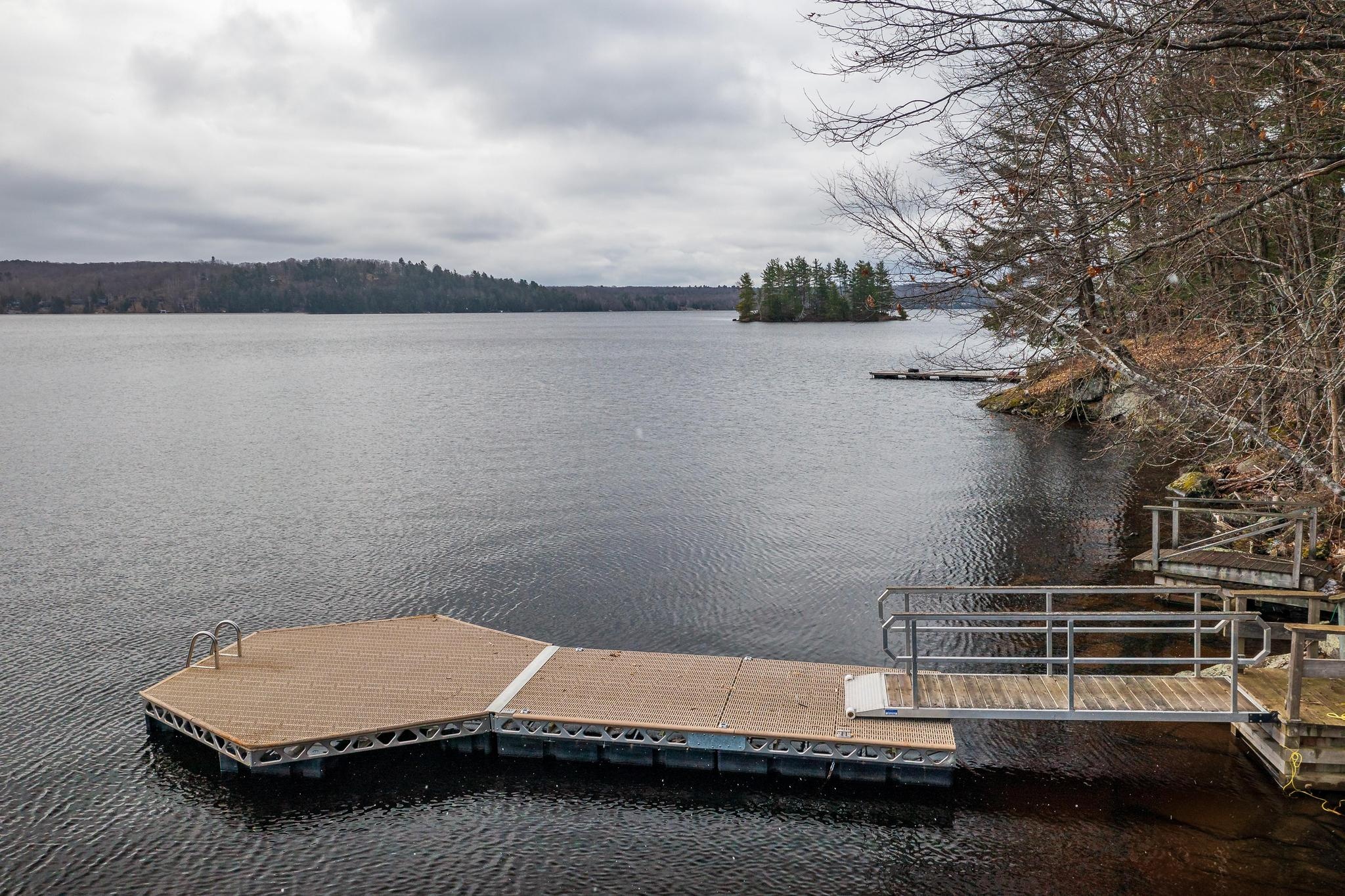The cottage/home as it is right now has four bedrooms plus a den, three full bathrooms, about 2500 sq. ft. of living space on 4 levels with the master suite being on the upper floor. Stairs to each level are easy to navigate. There is a bedroom and bathroom on the ground floor for one-floor living if needed. Renovations were completed in 2006. There is a walkout from the living/dining area to a large deck overlooking the lake. Two bunkies offer accommodation for overflow guests, with one of the bunkies by the water’s edge. Newer Canada Docks docking system.